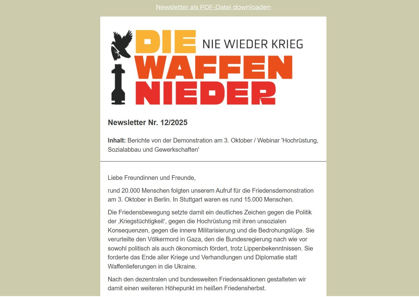 Ab dem 9. Oktober wird unser neuester Newsletter verschickt. Der Schwerpunkt liegt auf den Berichten von unserer Demonstration am 3. Oktober 2025 in Berlin und in Stuttgart. Darüber hinaus laden wir für ein Webinar zum Thema „Hochrüstung, Sozialabbau und Gewerkschaften“ ein.