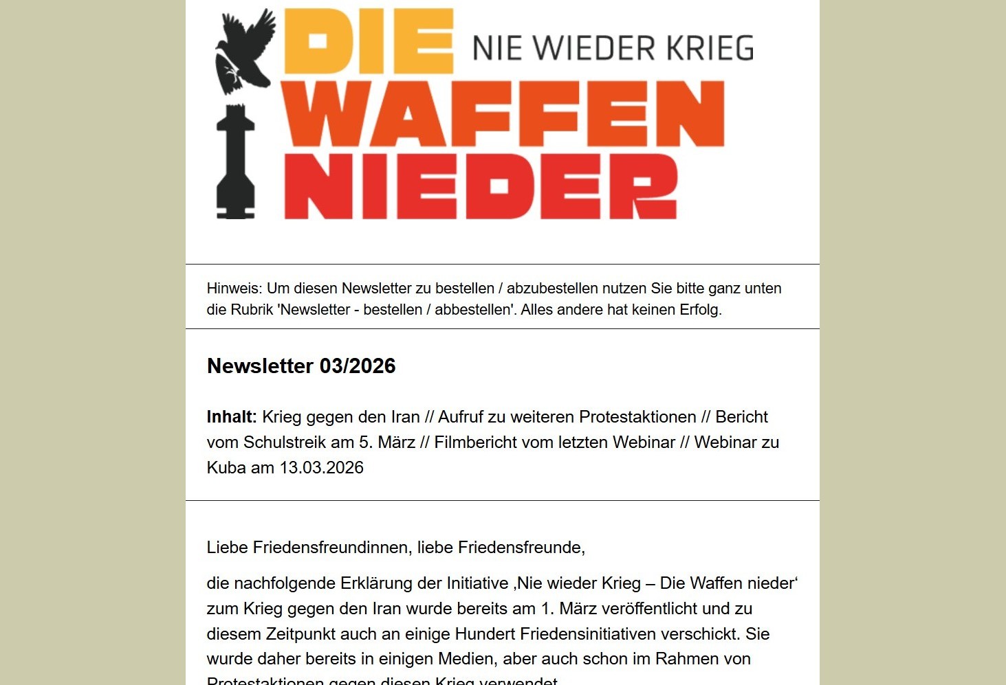 Am 7. und 8. März 2026 wurde unser Newsletter 03/2026 verschickt. Der Schwerpunkt liegt in diesem Newsletter auf dem Krieg gegen den Iran. Wir verschicken unsere Stellungnahme vom 1. März, die an diesem Tag bereits an einige Hundert Friedensinitiativen verschickt wurde. Und wir rufen auf zu weiteren Protestaktionen. Beispielsweise in Hamburg am 13. März. Darüber hinaus gibt es Berichte von den Schulstreiks am 5. März mit rund 50.000 Teilnehmenden – und wir laden ein zu einem Kuba-Webinar.