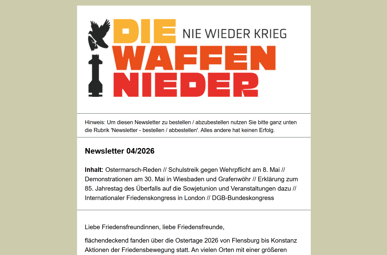 Am 23. April 2026 wurde unser Newsletter 04/2026 verschickt. Der Schwerpunkt liegt in diesem Newsletter bei folgenden Themen: Nächster Schulstreik am 8. Mai 2026; Demonstrationen am 30. Mai in Wiesbaden und Grafenwöhr; Erklärung: Russland ist nicht unser Feind. Darüber hinaus gibt es einen kurzen Rückblick auf die Ostermärsche sowie Ankündigungen für verschiedene Veranstaltungen. Darunter einen Internationalen Friedenskongress in London sowie Veranstatungen im Zusammenhang mit dem 85. Jahrestag des Überfalls auf die Sowjetunion. Wir informieren zudem über einen Brief an alle Delegierte und Gäste des bevorstehenden DGB-Bundeskongresses.