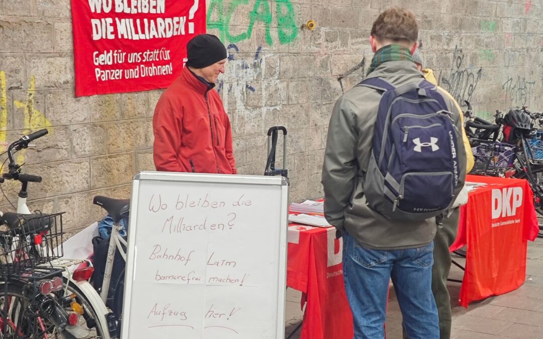 Am 27. März fand in der Unterführung des S-Bahnhofs Laim eine Aktion der DKP Gruppe München Nord-West gegen die fehlende durchgehende Barrierefreiheit statt. Seit Beginn der Bauarbeiten für die 2. Stammstrecke im Januar 2024 ist der Bahnhof nicht mehr barrierefrei. Zwar wurde der nördliche Bahnsteig (stadtauswärts) im Dezember 2025 wieder mit einem Aufzug erschlossen, der südliche Bahnsteig (stadteinwärts) bleibt jedoch weiterhin nicht barrierefrei. Während Milliarden in das Infrastrukturprojekt fließen, wurde eine durchgehende Barrierefreiheit während der Umbauphase von der Deutschen Bahn als „Nicht machbar beziehungsweise sündhaft teuer“ abgelehnt. Von den 500 Milliarden Euro „Sondervermögen“ für Investitionen in die (kriegsnotwendige) Infrastruktur kommt hier nichts an.